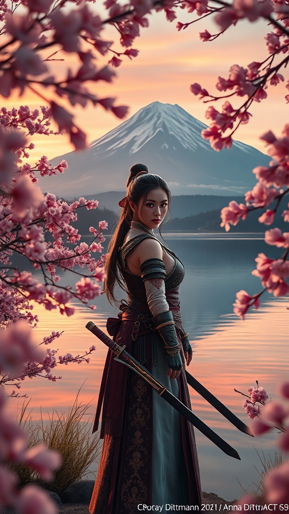 A mesmerizing portrait of a female warrior standing gracefully by a serene lake framed by cherry blossoms, with Mount Fuji's majestic peak in the background, capturing the essence of spring at sunset; meticulously centered with intricate detailing, showcasing breathtaking beauty and precision in digital art. The scene is vibrant, crafted with comprehensive cinematic vision, featuring the signature touch of Anna Dittmann, enhanced by ethereal volumetric lighting, complete with an elegant watermark mentioning the artist and copyright information.