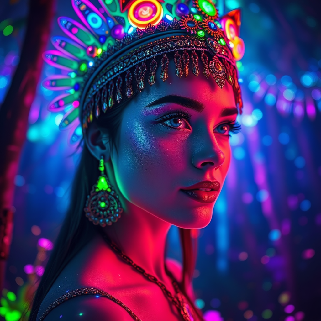 portrait wide angle shot of eyes off to one side of frame, ethereal dream-like woman, gazing into the distance, daydreampunk style with glowing skin and eyes, adorned with an ornate headdress, radiant and dripping in vibrant neon lights, an explosion of blue, green, and purple bioluminescence in her aura background, set in a vivid neon forest wonderland, alive with particles and shimmering hues of blue, green, and purple, following rule of thirds, golden ratio, with asymmetric composition, a hyper-maximalist approach, rendered with octane, capturing photorealism and cinematic realism, like a scene from unreal engine, rendered in stunning 8k resolution