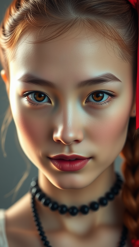 Portrait with charming face, soft pale cheeks, and smooth skin adorned with a black beaded necklace. Red braided hair tied with a red ribbon, perfectly composed and hyper-realistic, showcasing intricate details in 8k high quality, trending art style. Captured in sharp focus, reminiscent of renowned artists like Greg Rutkowski, achieving a remarkable depth and clarity comparable to studio photography. In UHD and HDR, displaying textured skin and detailed pupils, akin to a shot with a cinematic camera. This artwork avoids common pitfalls such as low resolution, distortion, or artifacts, maintaining a cohesive, high-quality visual narrative without unnecessary embellishments or errors.
