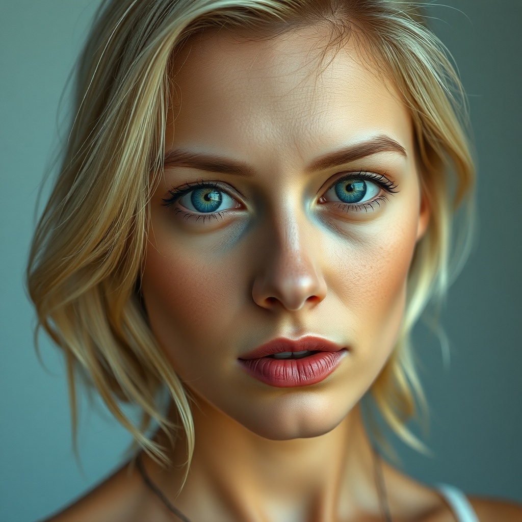 A stunning portrait of an ohwx woman gazing confidently at the viewer, a 40-year-old with a full body pose. Captured with a Leica 50mm lens, the photograph boasts exceptional quality and high resolution, enhanced by the exquisite lighting reminiscent of Hasselblad photography. Her blonde hair frames a face with textured and naturally imperfect skin, offering a sense of realism. The art piece blends styles of airbrushed and 3D render techniques, with elements of painting, anime, manga, and illustration woven together. Despite the surreal aspects, there’s a focus on maintaining human anatomy, avoiding any additional or missing limbs. Muted details like big eyes and unique features like piercings are subtly included. The essence of the snapshot remains a harmonious fusion of cartoon-like smoothness and a child's wonder. The face is captured with elegance, avoiding any exaggerated features, while the minimalist approach to jewelry contributes to the picture-perfect yet genuine portrayal of beauty.