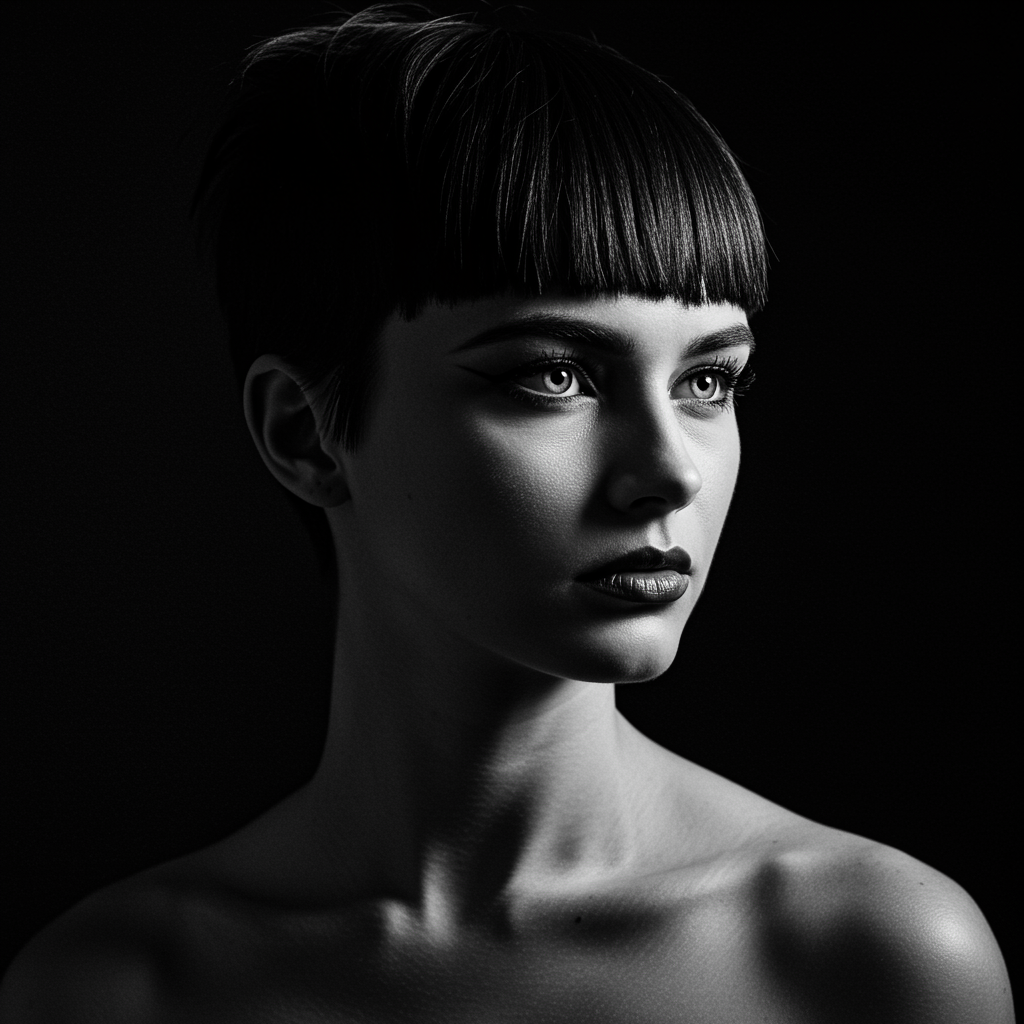 A striking portrait of a young woman with an edgy haircut and intense eyes, captured in a high-contrast style that accentuates her angular features with bold shadows and highlights. Photographed with a vintage film camera using a fast prime lens, the image has a gritty, textured quality. The portrait exudes a sense of mystery and sophistication, ideal for fashion editorials, dynamic advertising campaigns, or as captivating wall art.