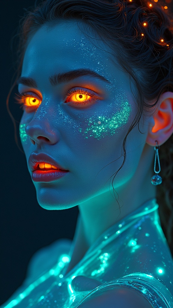 View this AI-generated image featuring a captivating portrait of an enigmatic woman with luminescent neon skin embodying the essence of technological wonders her features are highlighted with hues of light indigo and warm amber contrasted with deep white and vibrant turquoise she exudes a sense of k