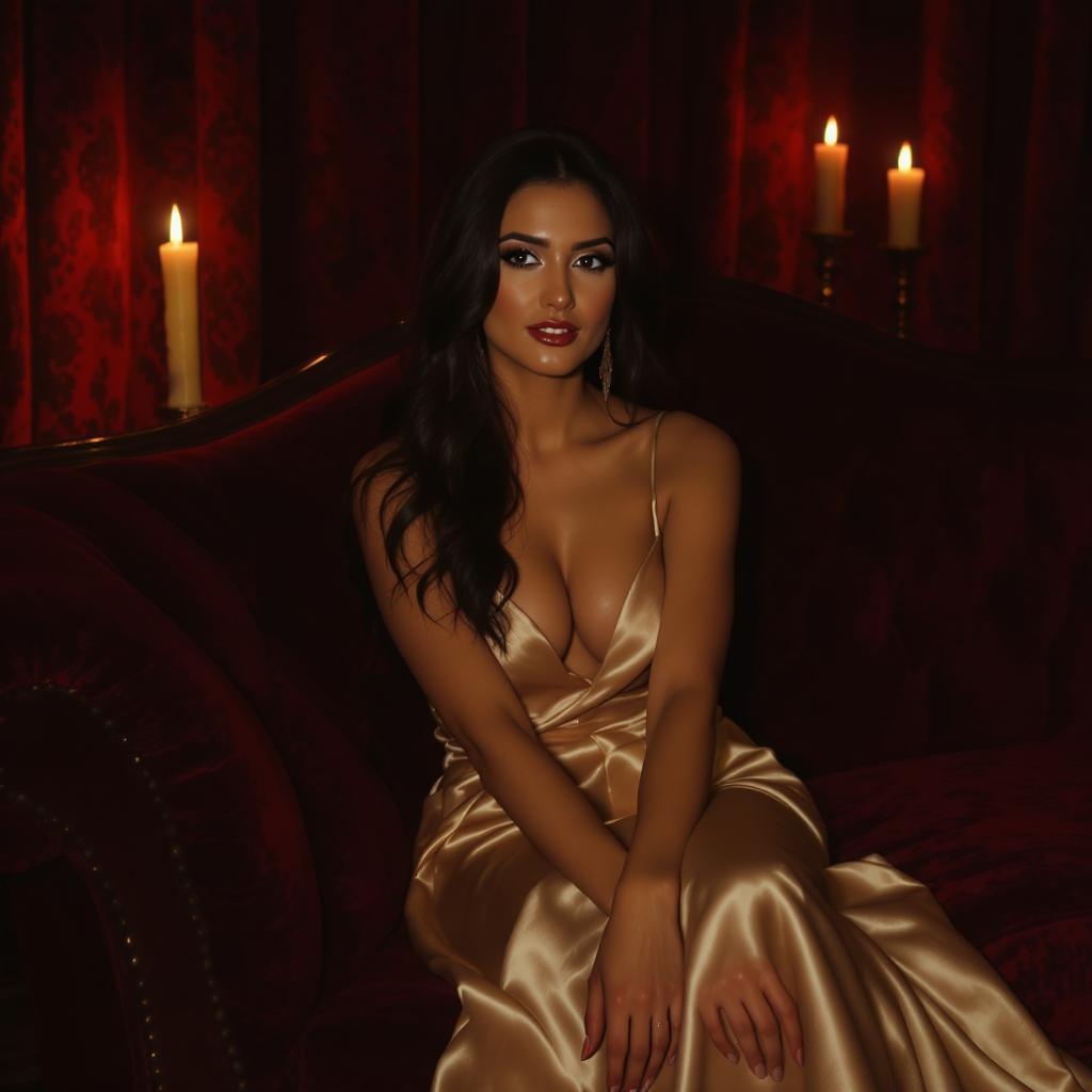 A captivating portrait of a stunning woman seated gracefully on a velvet couch in an intimately dim space, illuminated by the gentle flicker of candlelight. Her long, lustrous hair cascades down in soft, elegant waves. She is adorned in a delicate silk gown that shimmers subtly under the candle's glow. The atmosphere exudes warmth and tranquility, with shadows dancing softly around her serene expression.