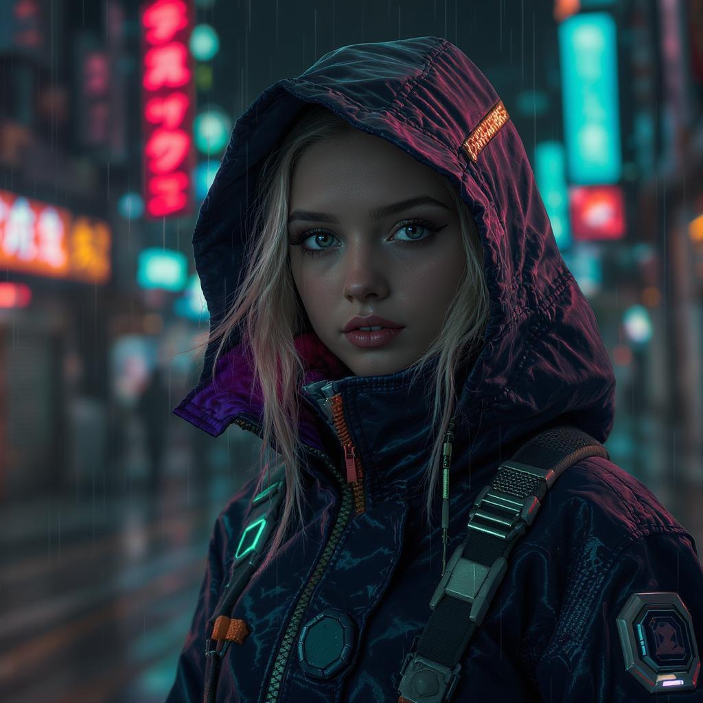 A striking portrait of a European young girl wearing a futuristic storm rain jacket coat, designed with a sci-fi fashion flair. Her attire resembles royal garments, inspired by visionary artists like Ismail Inceoglu and Dragan Bibin, featuring sharp details and realistic textures. Her flawless face is highlighted with a sharp chin and an aura of cyberpunk elegance, reminiscent of a Blade Runner movie scene with dramatic lighting. The setting exudes a neo-Tokyo synth-wave aesthetic, illuminated by low-emission neon lights. Utilizing high-detail raw color photography, the portrait captures hyper-realistic textures with rich colors in an ultra-high-resolution 8K CGI rendering, showcasing meticulous craftsmanship akin to fine art illustrations. While the lighting accentuates her lifelike features, the composition avoids typical pitfalls such as anatomical inaccuracies, ensuring a harmonious blend of realism and futuristic fantasy. Her expression is poised and confident, embodying a modern-day heroine of a cyberpunk narrative.