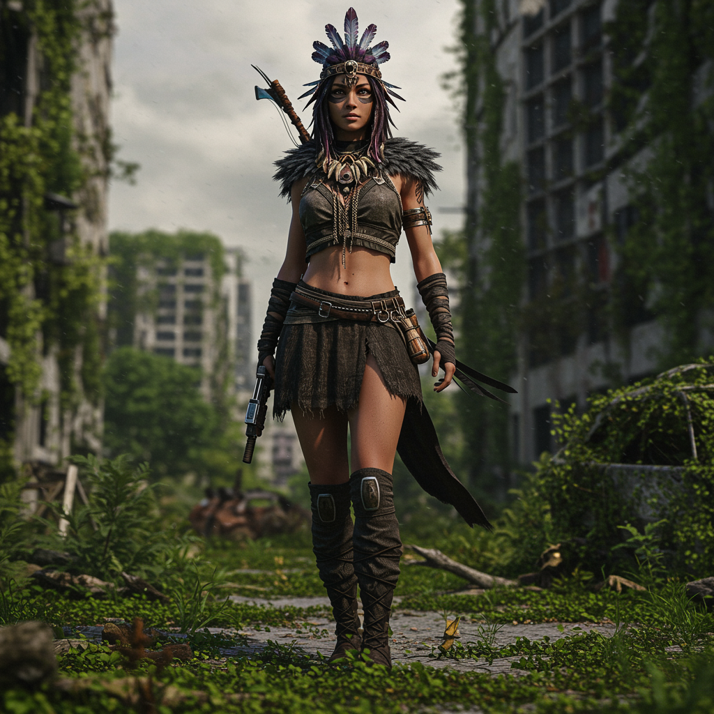 View this AI-generated image featuring portrait of a stunning young tribal woman standing in a post apocalyptic urban landscape overtaken by verdant foliage inspired by the styles of luis royo and greg rutkowski dark and gritty with intricate details featuring volumetric lighting and atmospheric dep