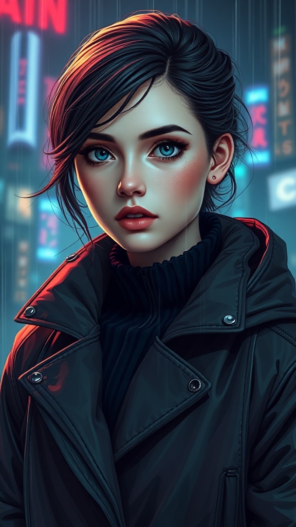 A detailed portrait of a European young girl in a storm rain movie jacket coat, embodying futuristic sci-fi fashion and royal attire. The style is inspired by the works of artists like Ismail Inceoglu, Dragan Bibin, Hans Thoma, Greg Rutkowski, Alexandros Pyromallis, Nekro, and Rene Magritte. The illustration features a perfect face with a sharp chin, showcasing fine details and realistic shading. The pretty, fine face captures the essence of cyberpunk, neotokyo, and synth-wave aesthetics, characterized by a futuristic, low-emission-neon ambiance reminiscent of a Bladerunner movie scene. The digital art depiction blends CGI, 3D elements, and an anime-influenced style, ensuring a captivating and unique representation. Elements like overly large features, poor proportions, and unnecessary duplications are avoided, while subtle creative modifications are incorporated, maintaining the core concept. The character is elegantly portrayed, exuding sophistication and futuristic charm, set against a backdrop that enhances the scene’s immersive narrative.