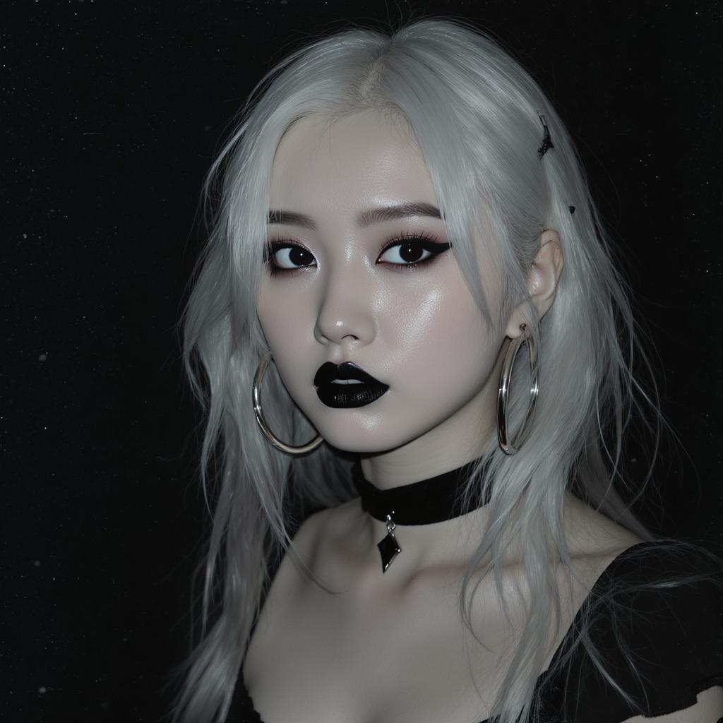 View this AI-generated image featuring portrait of an alluring young goth girl with midnight black lipstick and dark eyeliner her silver white hair cascading around her shoulders adorned with striking large silver hoop earrings the image possesses a subtle film grain shot with high quality on a niko