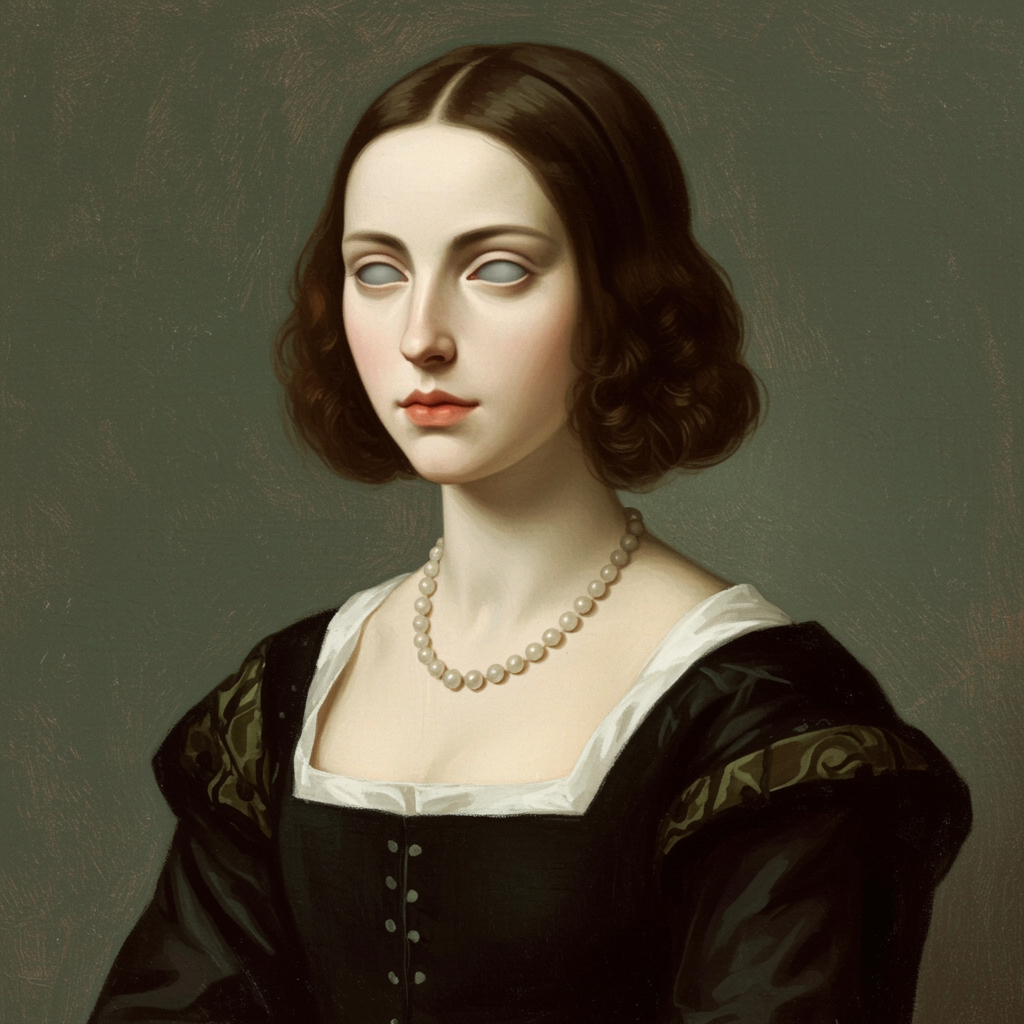 Portraits of a woman in an oil painting style, featuring a grainy texture with minimalist avant-garde elements and detailed, empty eyes; reminiscent of an old painting by Diego Velazquez, capturing a blend of classic and modern aesthetics with a touch of surrealism, presented in a 16:9 aspect ratio, highly stylized with intricate details that subtly transform the traditional into the contemporary.
