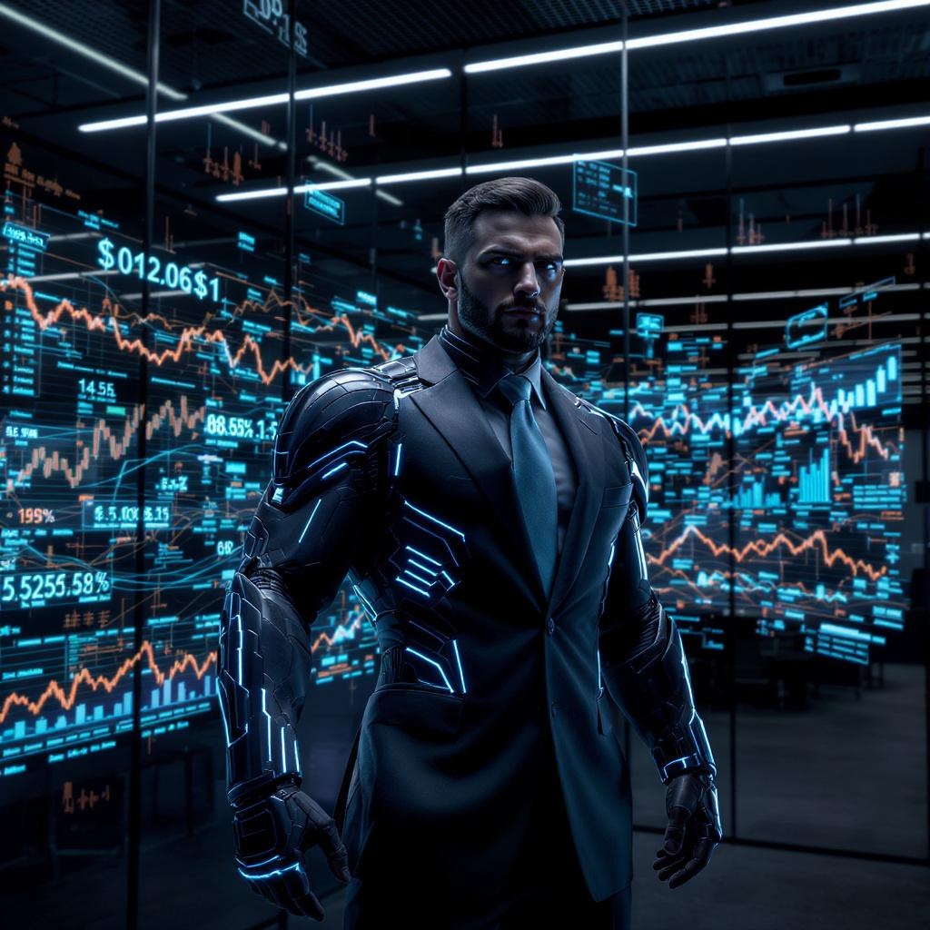 View this AI-generated image featuring a dynamic portrayal of a savvy entrepreneur clad in sleek high tech armor his crisp suit glinting under the dramatic corporate office lighting the scene captures his intense focus as he stands at the helm of a sprawling glass walled boardroom holographic projec
