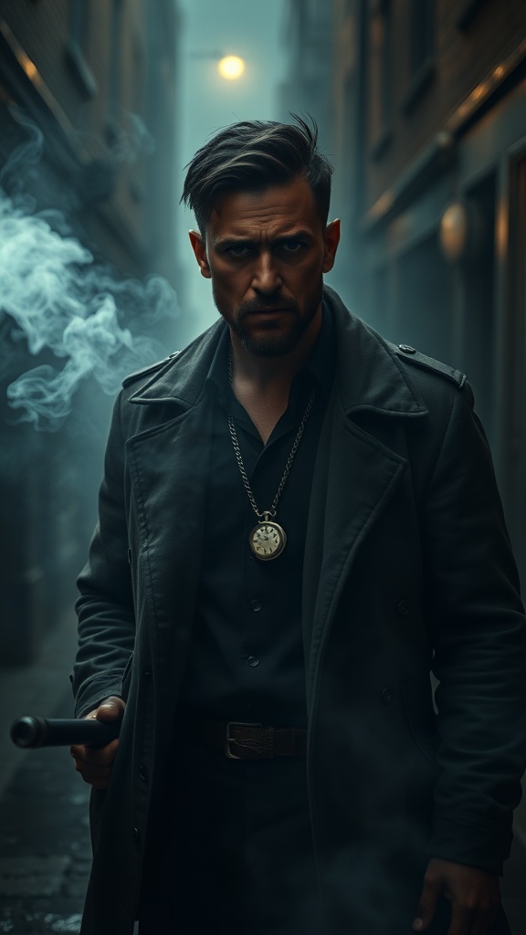 A hyperrealistic portrayal of a gang member from the Peaky Blinders, standing in a dimly lit, fog-laden alleyway with smoke curling mysteriously around them. Their expression is intense, capturing the essence of raw determination and fierce loyalty. The scene is gritty and cinematic with noticeable film grain, conveying a sense of impending action and drama. The subtle glint of a pocket watch chain catches light, echoing the era's style. Shadows play across the wet cobblestones, enhancing the mood with a touch of foreboding tension.