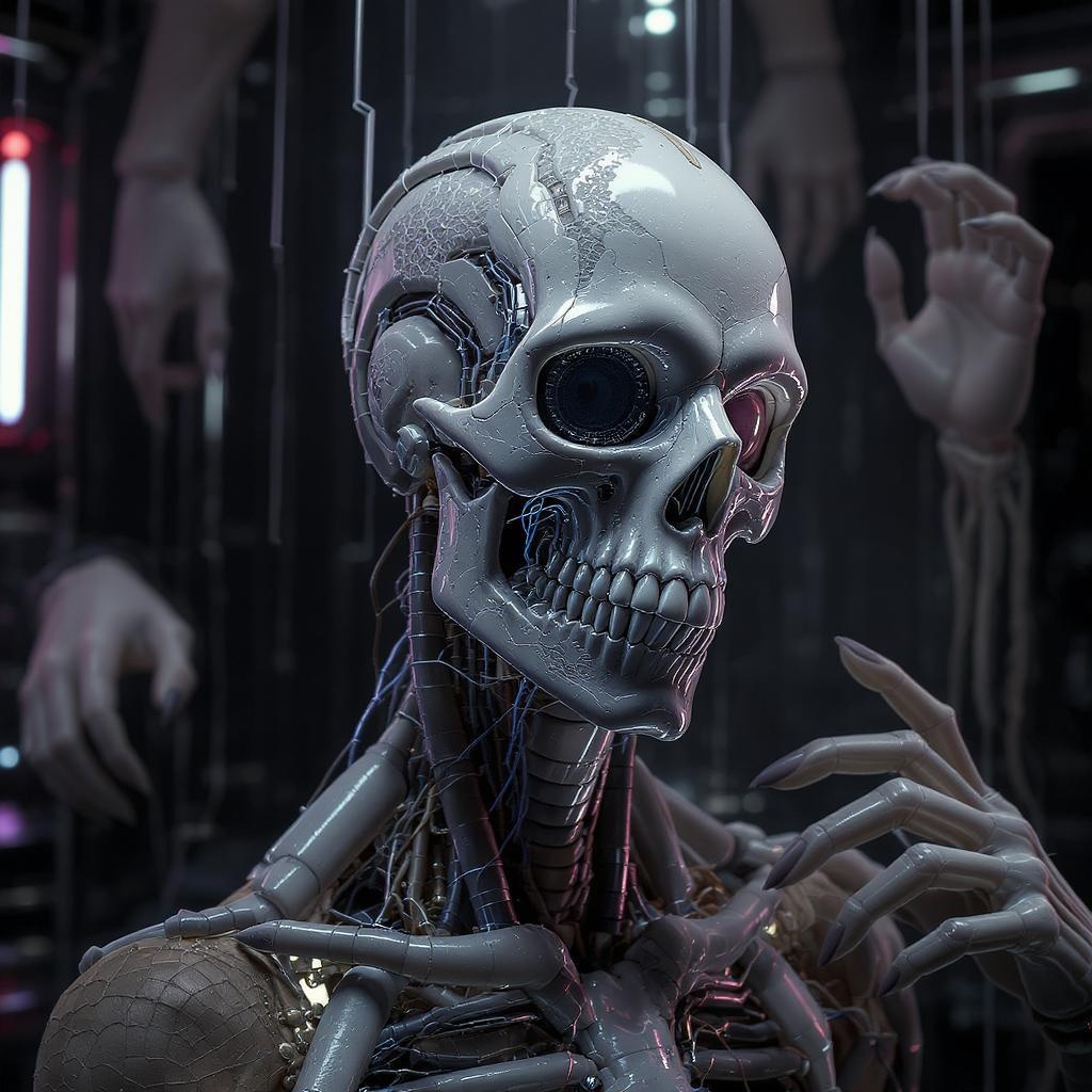 A hyperrealistic portrayal of a porcelain reaper skull android face with intricate cyborg features and robotic parts, set in a luxurious cyberpunk environment. The model showcases vibrant details under beautiful studio soft light and rim lighting, with lace patterns subtly integrated into the design. Electric wires, microchips, and elegant anatomical facial muscles are meticulously detailed, all rendered in an H. R. Giger-inspired style. The scene incorporates blurred floating limbs and malformed hands, contributing to a surreal ambiance, with a focus on the elongated neck and body. The image is rendered using octane with an emphasis on a beautiful yet disconcerting background. Despite the intricate details, some elements like poorly-drawn faces and extra limbs appear grained and out of focus, while the black and white palette adds a mysterious depth to the composition, creating a vision both intriguing and haunting.