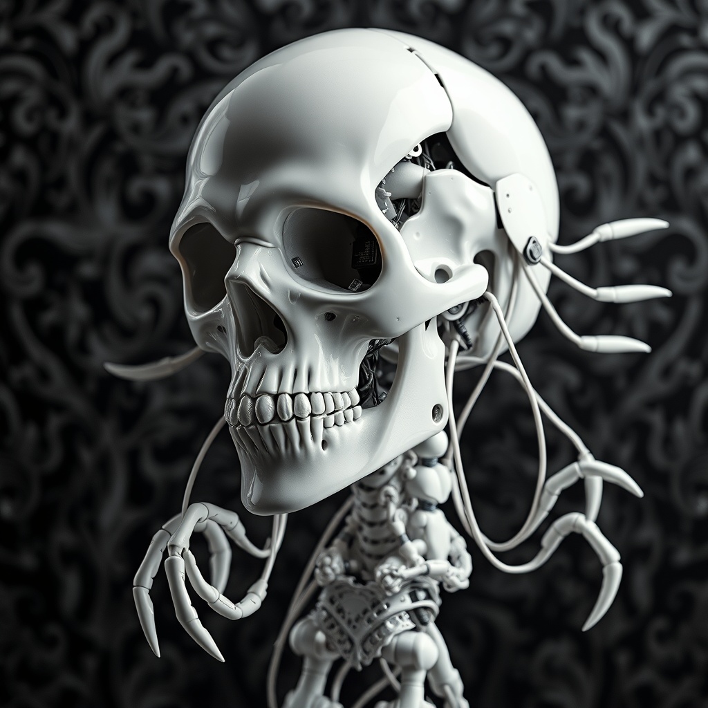 View this AI-generated image featuring a hyperrealistic portrayal of a porcelain reaper skull blending android and cyborg elements with robotic parts set at 150 mm scale the face is intricately detailed with anatomical features including a fusion of facial muscles and elegant cable electric wires al