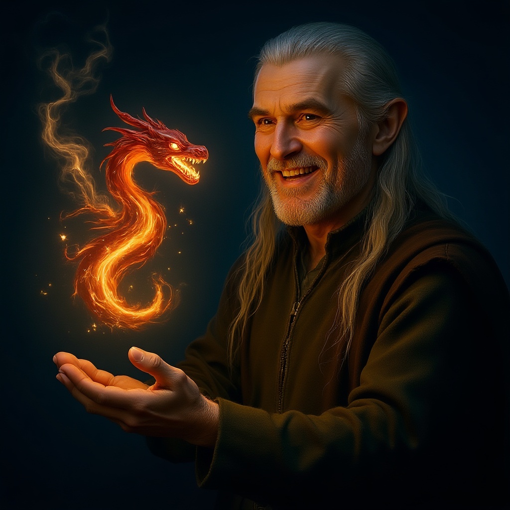 A cinematic portrayal of Gandalf the Grey from the chest up, featuring an intimate, focused crop as he gazes directly at the viewer with warmth and a touch of a smile. His open hand is slightly raised, fingers curled gently as he conjures an ethereal dragon made entirely of vibrant fireworks and swirling smoke hovering above his palm. The dragon, brilliantly detailed, coils gracefully in mid-air, its body flickering in deep oranges, crimsons, and golds, with eyes that burn intensely. Its open jaws release tiny sparks, casting a warm, shifting light that illuminates Gandalf’s face and hand. Delicate smoke trails off its wings and tail, creating a ghostly, ephemeral essence. The deep, rich blue background fades into shadow, allowing the dragon to stand out vividly. Soft, volumetric lighting adds depth and atmosphere, as magic dust floats in the air, reflecting the dragon's glow. Gandalf’s robes and hand are lit by this warm glow, with textures highlighted by the interplay of light and shadow. The painting captures this enchanting moment with hyperrealistic detail, where every fiery flicker and smoky tendril is rendered with lifelike precision, evoking a scene both mystical and cinematic.