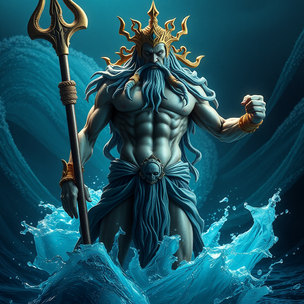Poseidon from Greek mythology reimagined as a One Piece character, featuring a symmetrical and athletic full body, with intricate details and textures. The scene is illuminated with dramatic, cinematic lighting and high contrast, set against a dynamic water background. The art is rendered in 8K resolution, suitable for a character concept art piece on ArtStation, showcasing a unique blend of mythical and maritime elements within a vertical composition.