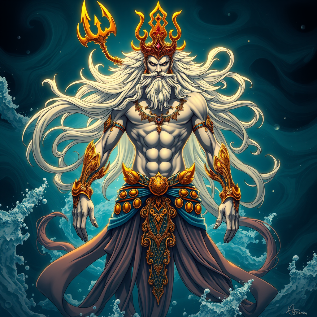 Poseidon-inspired character from Greek mythology reimagined as a One Piece character, featuring a symmetrical and intricate full-body design, with highly detailed and cinematic lighting, high contrast imagery reminiscent of artstation character concept art in 8K resolution, set against a dynamic water background, incorporating aquatic elements with a mythical flair, emphasizing a regal and commanding presence, with flowing hair and attire that reflects the ocean’s power and mystery.