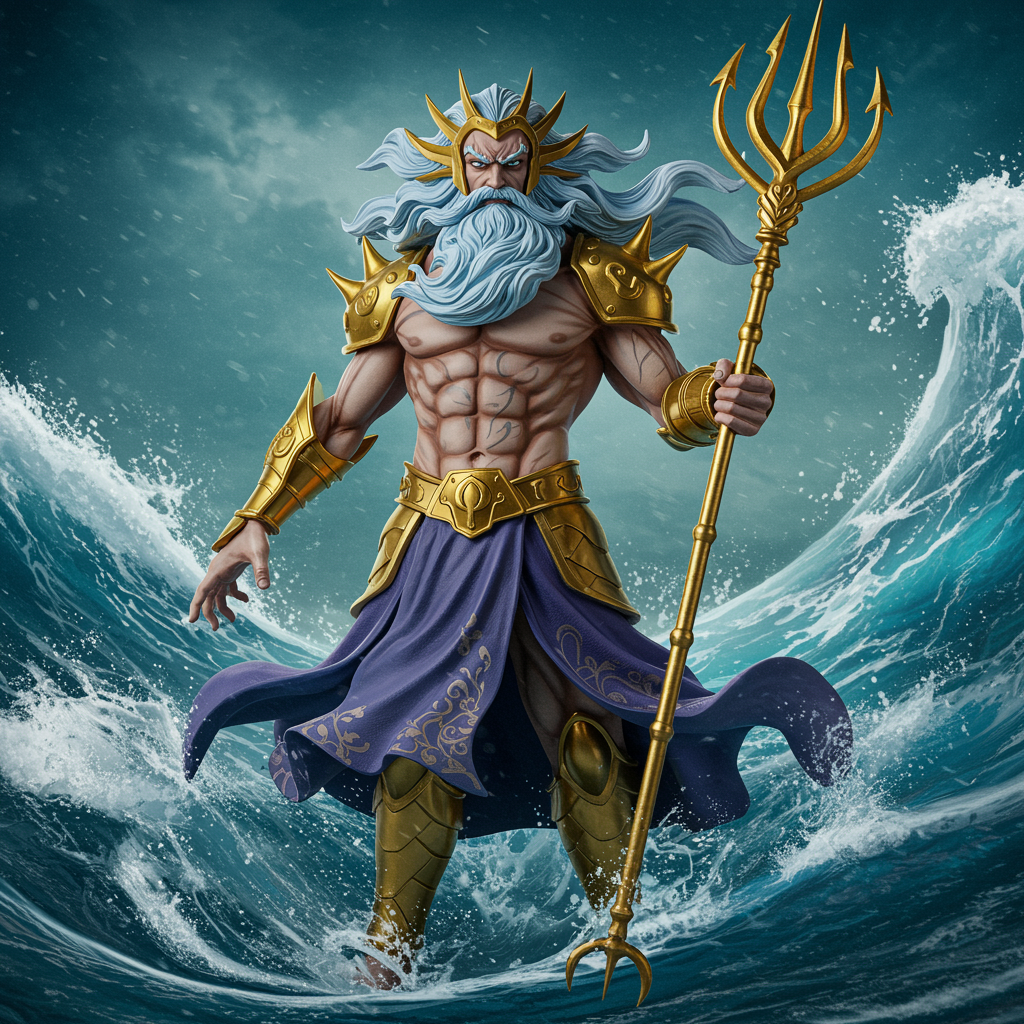 Poseidon-inspired character from Greek mythology, reminiscent of a One Piece figure, featuring a symmetrical physique, full-body portrayal, intricately detailed with cinematic lighting and high contrast, character concept art style seen on ArtStation, set against a dynamic water background, rendered in 8K resolution, emphasizing mythical and oceanic elements in a vertical 9:16 aspect ratio, with a touch of imaginative flair and stylization.