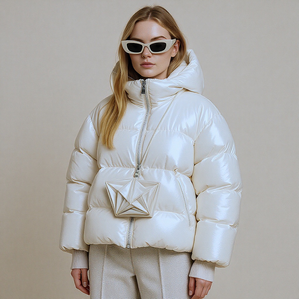 In the image, a woman poses against a neutral beige backdrop, exuding the aura of a Tumblr icon. She wears a sleek, reflective puffer jacket layered over a chic poncho, both in a sophisticated off-white palette, hinting at a playful nod to an internet meme or trend. This look is gaining traction on the renowned design and architecture platform Dezeen, capturing the essence of the 2024 fashion zeitgeist. Her ensemble is complemented by a stylish mac, statement-making 8.0 LV sunglasses, and an intricately folded piece crafted by designers Mike and Wojtek Fus. This innovative outfit is a true testament to the avant-garde fashion of the year, promising to captivate attention and set trends.
