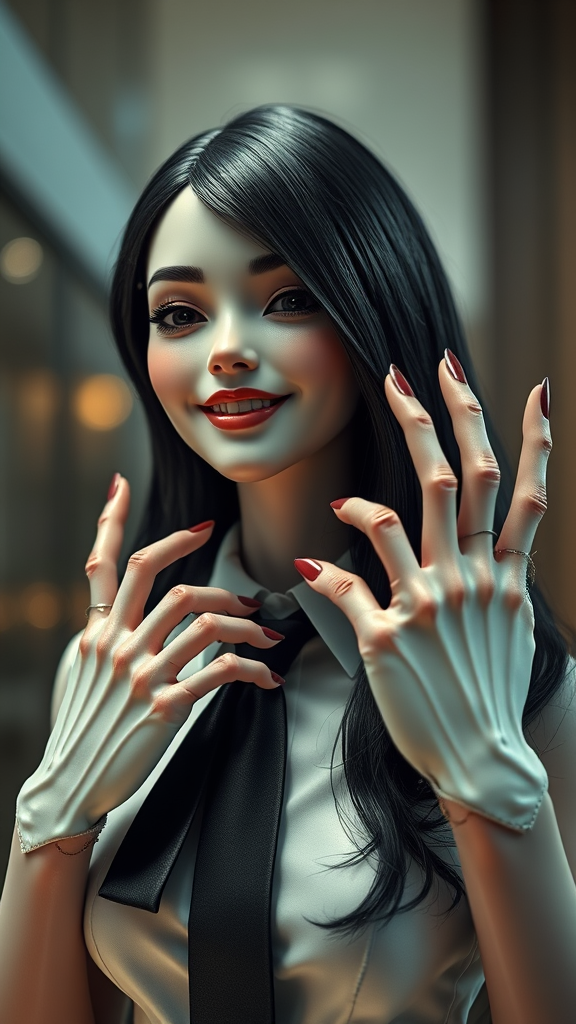 Posh woman with a detailed, beautiful face and black hair, wearing a tie; her white shiny skin appears humid and she smiles gracefully. The scene resembles a CGI 3D render with a doll-like quality, created using Octane Render. Despite attempts to capture elegance, the image is low-res and suffers from issues like JPEG artifacts and blurriness. The woman has disfigured, mutated hands with extra fingers, and her face and limbs show signs of poor anatomy, bad proportions, and mutations. Her elongated neck and gross proportions add to the overall uncanny appearance, with limbs and fingers occasionally fused or excessively numerous. The result is a surreal, distorted portrait that blends elegance with unsettling features.