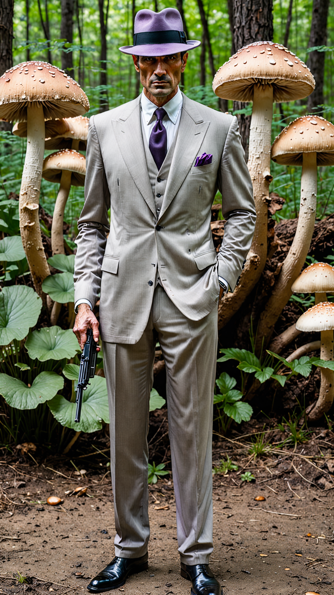 Possible Mushroom Person. Mafia boss, middle aged man. Mushrooms tend to sprout at his touch. Wears a pale grey fedora hat and double-breasted suit with a lavender handkerchief in his pocket. Black wing-tipped dress shoes. He is tall, strong, lanky but well built. Very short black hair, slicked back. Very pale skin for lack of sunlight, weird beige tint to it. Large black eyes with very little white in them. Clean shaven, strong brow and chin. Has a gun, but can throw mold spores at people. He can cause any type of mushrooms to grow, especially toadstools. Full body pose.