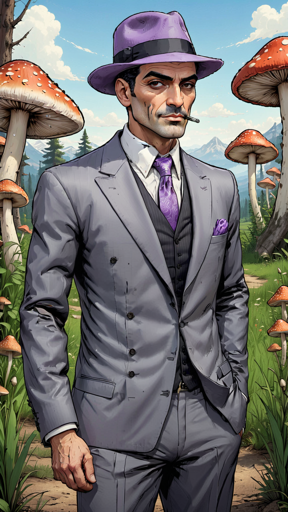Possible Mushroom Person. Mafia boss, middle aged man. Mushrooms tend to sprout at his touch. Wears a pale grey fedora hat and double-breasted suit with a lavender handkerchief in his pocket. Black wing-tipped dress shoes. He is tall, strong, lanky but well built. Very short black hair, slicked back. Very pale skin for lack of sunlight, weird beige tint to it. Large black eyes with very little white in them. Clean shaven, strong brow and chin. Has a gun, but can throw mold spores at people. He can cause any type of mushrooms to grow, especially toadstools. Full body pose.