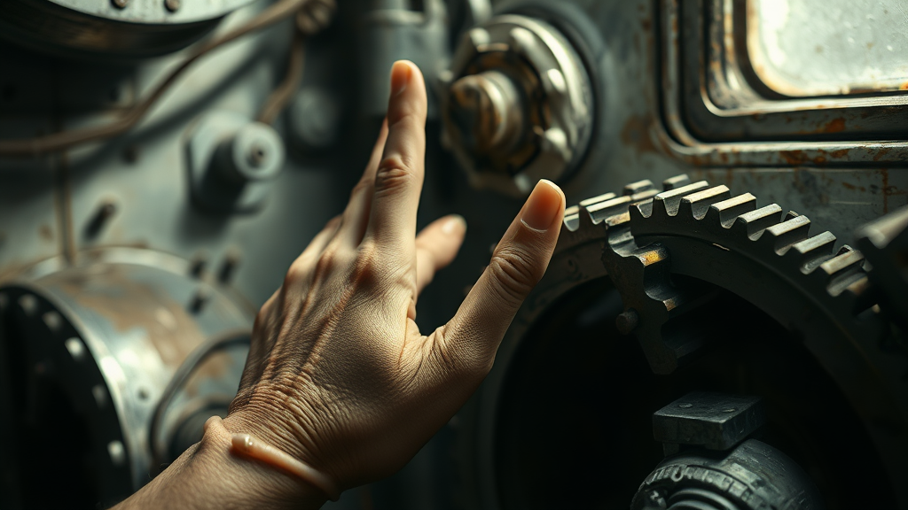 Post-apocalypse, high-detail RAW color photo, closeup shot of a Soviet-era kitchen, featuring delicate hands with captivating eyes amidst mechanical gears; soft lighting with shadow casting, deep focus, captured with a Canon 5D and 24mm macro lens, F/8 aperture, resembling a cinematic film still; intriguing elements such as elongated forms, surreal fused fingers, and an unusual twist to the scene; eliminating low-quality aspects and maintaining a sense of artistry and intrigue in a hauntingly beautiful setting.