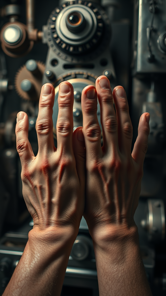 Post-apocalypse, high-detail RAW color photo, closeup shot of a Soviet Union kitchen, featuring intricate machinery and gears, with an emphasis on alluring eyes and mechanical elements. Soft lighting highlights the scene, casting dynamic shadows in deep focus. Photographed using a Canon 5D with a 24mm macro lens at F/8 aperture, reminiscent of a film still. Imperfect hands are depicted with unique details such as fused and extra fingers, conjoined forms, resulting in an interesting, abstract representation. The setting includes subtle, artistic mutations as a creative element, avoiding any text, logos, or distracting artifacts, aiming for a visually captivating and surreal depiction.