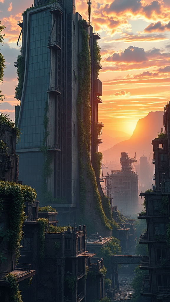 Post-apocalyptic cityscape in a world reminiscent of Horizon Zero Dawn, rendered in Final Fantasy ink style, featuring ancient ruins intertwined with overgrown foliage and advanced robotic creatures. Dramatic lighting casts shadows over towering skyscrapers, their glass facades shattered, revealing the skeletal steel beneath. Lush vegetation cascades from balconies and windows, creating a vivid contrast against the decaying urban environment. The setting sun bathes the sky in hues of orange and purple, highlighting the remnants of human civilization, with distant mountains shrouded in mist. In this scene, the fusion of nature and technology evokes a sense of haunting beauty and resilience, captured in breathtaking 8k resolution.