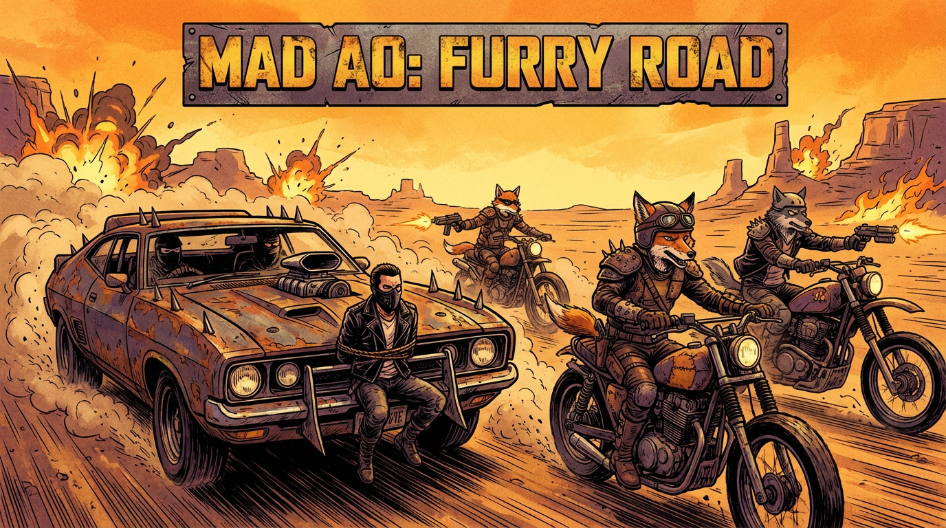 Comic book style illustration, post-apocalyptic desert chase scene. Central rusted, spiked muscle car with a purple-skinned, masked figure tied to the front, wearing a black leather jacket and pants. Furry anthropomorphic characters on motorcycles surround the car, some with fox or wolf features, in Mad Max-style gear. Explosions and fire in the background. Overhead text reads "MAD AO: FURRY ROAD" in distressed metal font. Warm, dusty orange and brown color palette, intense sunlight. Dynamic composition, action lines, dramatic lighting, high contrast. Sharp outlines, detailed textures.