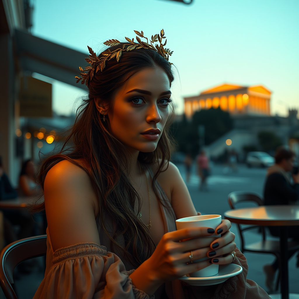 post classic portrait photography, bohemian style attire, hyper-realistic woman, seated at a street café, adorned with a delicate gold laurel headpiece, sipping espresso in contemporary Athens, with a twilight-softened Parthenon softly aglow in the distance