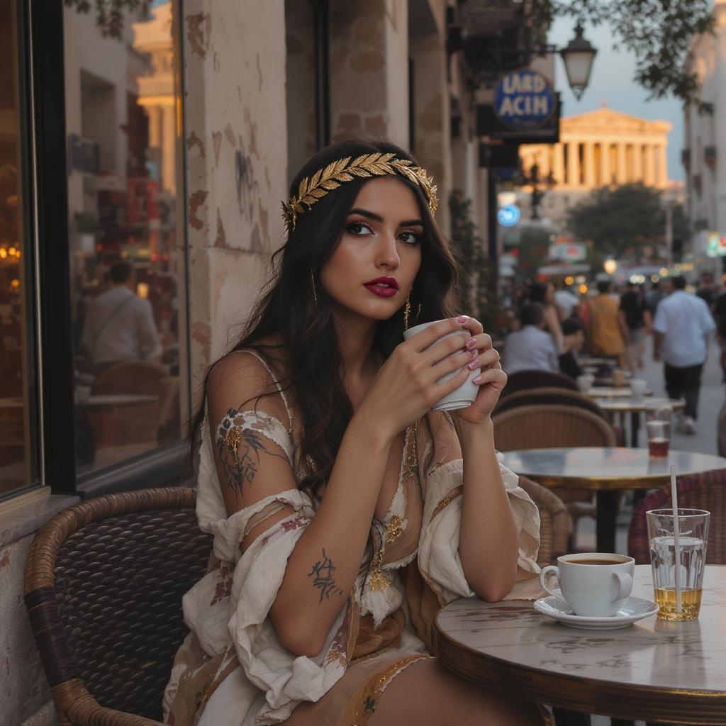 post-classic portrait photography of a super realistic woman in a bohemian outfit, casually seated at a street café, a delicate greek laurel gold crown adorning her head as she enjoys a cup of coffee. the modern athens streets around her buzz with life, the blurred silhouette of the parthenon glowing softly in the dusky background. the atmosphere captures a harmonious blend of timeless elegance and contemporary urban charm.