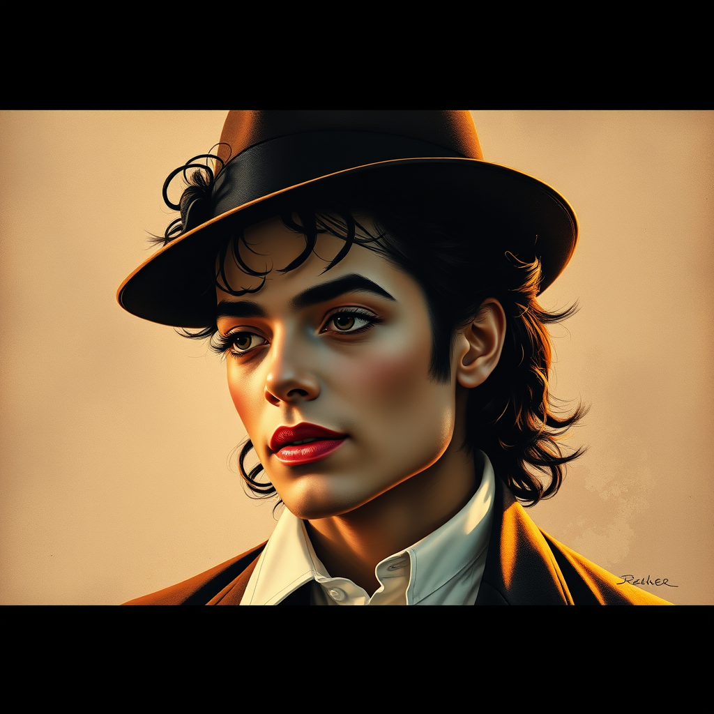 Poster art depicting a nostalgic portrait of Michael Jackson, blending the style of Michael Whelan with influences from Rossetti and Bouguereau. The artwork features a retro and old-fashioned aesthetic, infused with Artgerm's dynamic flair, capturing the essence of classic elegance and modern vibrancy.