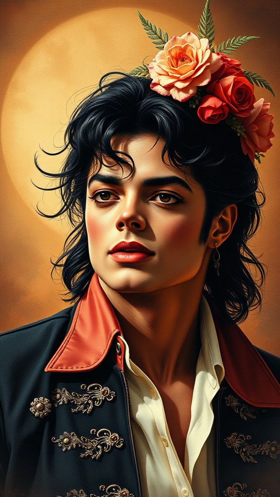 Poster art featuring a portrait of Michael Jackson, blending the styles of Michael Whelan, Dante Gabriel Rossetti, William-Adolphe Bouguereau, and Stanley 'Artgerm' Lau, with a retro, nostalgic, and old-fashioned flair. This piece captures the essence of classic 80s pop culture while infusing it with romantic and fantastical elements characteristic of 19th-century portraiture, all wrapped in a warm, vintage color palette.
