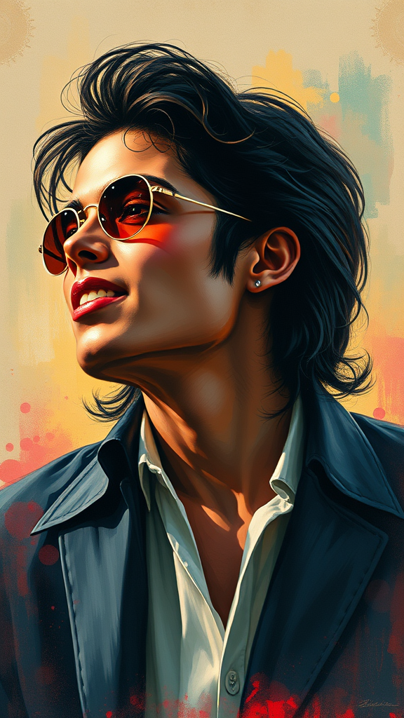Poster art portrait of Michael Jackson styled by influences of Michael Whelan, with hints of Rossetti and Bouguereau, incorporating Artgerm's dynamic flair; evokes a retro and nostalgic atmosphere with an old-fashioned charm, blending vibrant colors with delicate, detailed brushwork, capturing Michael's iconic presence in a timeless visual narrative.