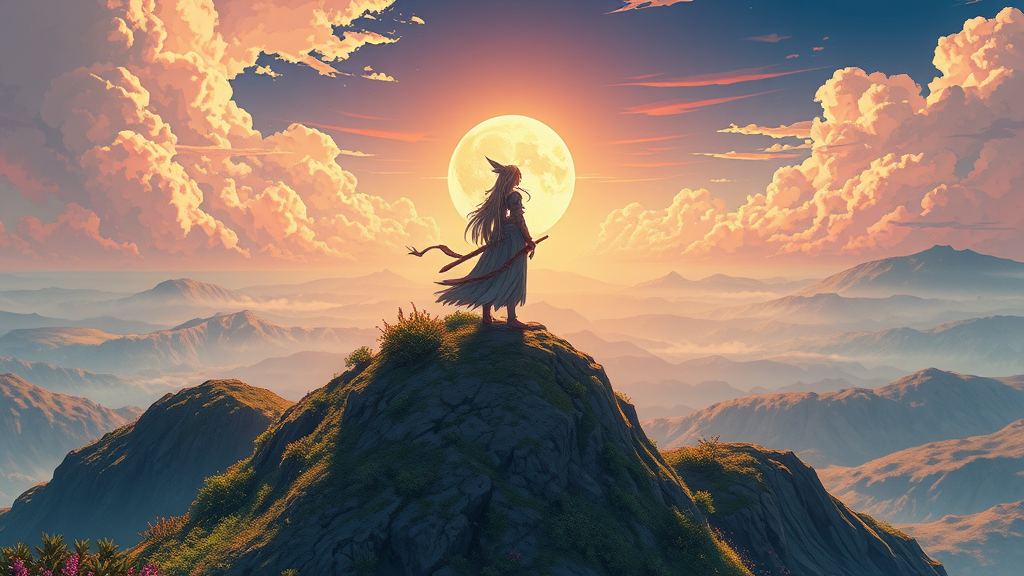 poster depicting a fierce warrior goddess standing alone atop a hill, centered in the composition, rendered in anime style as a key visual characterized by intricate and highly detailed artwork. The scene is breathtaking and vibrant, offering a panoramic and cinematic view. Inspired by the aesthetic sensibilities of Carne Griffiths, Conrad Roset, and Makoto Shinkai, the image combines delicate linework with a rich color palette, blending elements of fantasy and realism to captivate the viewer.