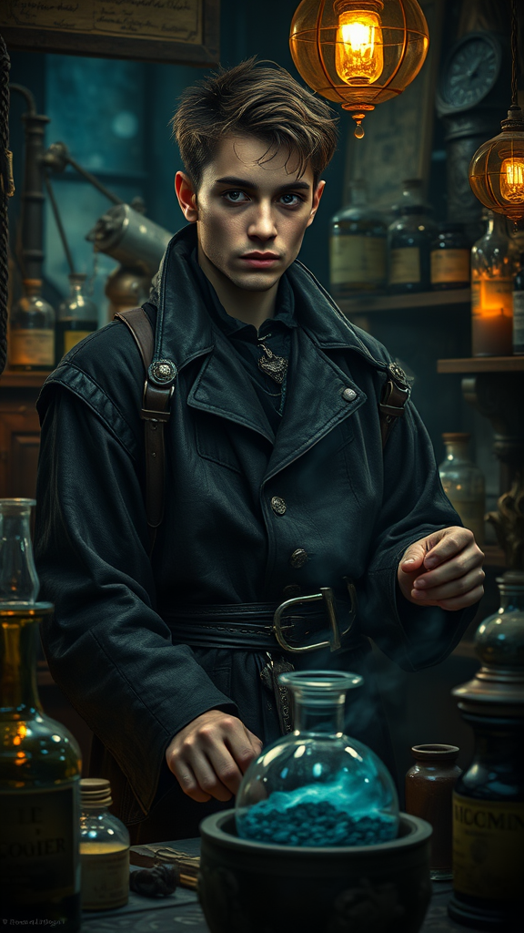 Poster featuring a young male alchemist in a medieval lab setting, capturing dark fantasy elements with intricate, hyperrealistic details. The scene depicts the alchemist surrounded by potions and mystical artifacts, wearing a detailed robe with leather accents. The atmosphere is enhanced by a dimly lit environment, highlighting the meticulous craftsmanship and the enigmatic aura of the laboratory. Despite the focus on hyperrealism, subtle imperfections and artistic interpretations add character, maintaining a sense of authenticity and texture. The emphasis is on creating an evocative and immersive portrayal that invites viewers into this mythical world.