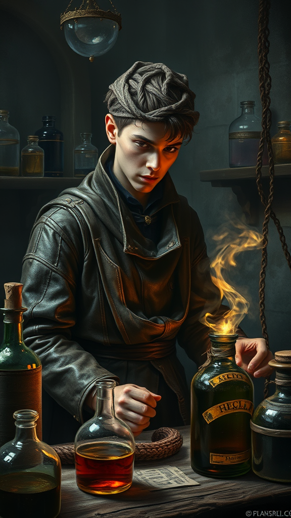 Poster featuring a young male alchemist in a medieval lab, surrounded by potions and intricate details. The scene captures a dark fantasy atmosphere with a hyperealistic style. The alchemist, dressed in a detailed robe made of leather, is focused intently on his work. His surroundings are rich with textures and shadows, emphasizing the intricate and enigmatic nature of his craft. Despite the low-quality depictions of hands and face, and the tendency for unusual mutations and proportions, the image exudes a mysterious charm. The muted background enhances the subject's prominence, creating an intriguing balance between realism and fantasy. Subtle layers of aesthetic imperfections add to the overall mystique, creating an artwork that feels both ancient and otherworldly.