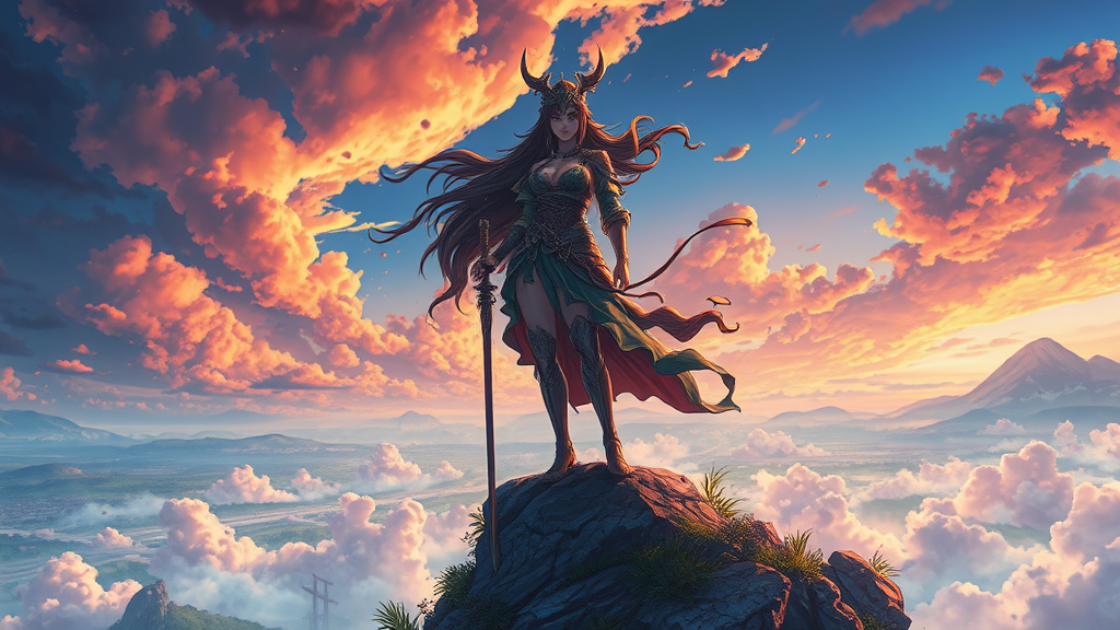 poster of a fierce warrior goddess standing alone atop a hill, centrally positioned, anime style, key visual, exhibiting intricate and highly detailed artistry, breathtaking and vibrant with a panoramic cinematic view, inspired by the styles of Carne Griffiths, Conrad Roset, and Makoto Shinkai, featuring a stunning blend of vivid colors and ethereal atmosphere, with a touch of mythical elegance and fantasy allure.