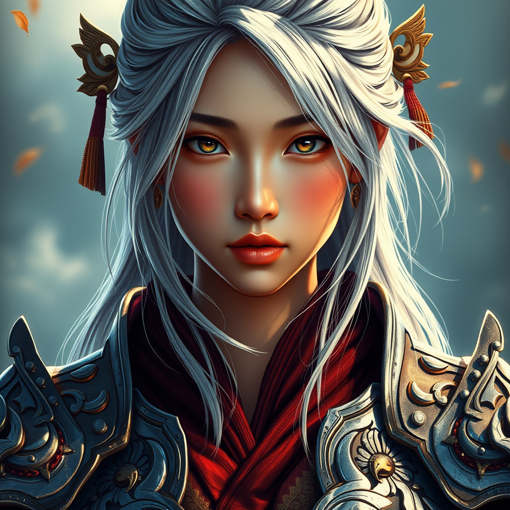 Poster of a stunning young Asian warrior, captivating expression, beautiful full-body portrait, sun-kissed olive skin, shoulder-length silvery hair, elegant yet protective armor, intricate and refined design, hyperrealistic details, cinematic lighting, highly detailed artwork, digital illustration, digital painting, masterpiece, awe-inspiring, advanced light effects with raytracing, vibrant colors, ethereal atmosphere, 16:9 aspect ratio.