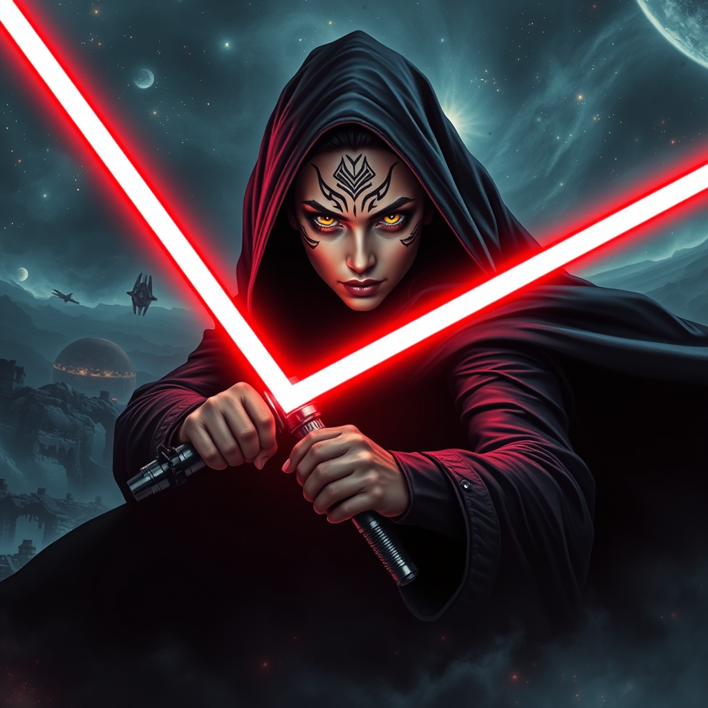 Poster showcasing a powerful female Sith Lord from STAR WARS, set in a dramatic 1:2 portrait aspect ratio. The Sith Lord, cloaked in dark robes, wields a double-bladed red lightsaber that glows ominously against a backdrop of a stormy cosmic landscape. Her piercing yellow eyes and intricate facial markings exude a sense of mystery and authority. In the background, silhouettes of distant starships and glimmers of distant galaxies emphasize the vastness of the universe. The scene captures an air of dominance and mystique, while subtle hints of ancient Sith architecture blend into the swirling nebulae, adding depth to the dark and atmospheric scene.