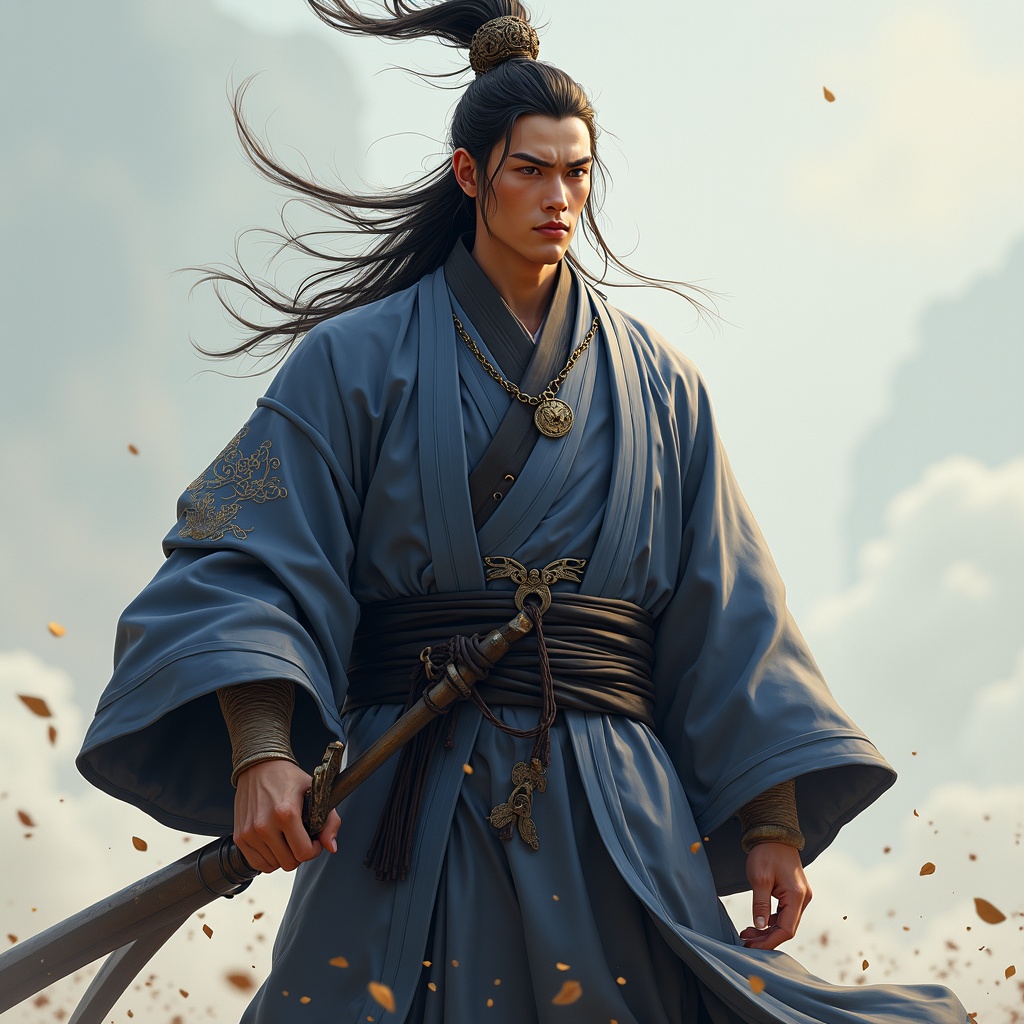 A kung pow-inspired character crafted with anime-inspired design, embodying the grandeur of Bernardo Strozzi's scale; the character stands tall, adorned in light navy and dark bronze garb, exuding a serene, zen-inspired aura. Influenced by Ron Embleton, the character is depicted with hyper-realistic details: intricately woven textiles shimmering under subtle light, a gaze that conveys both wisdom and strength, and dynamic poses that suggest fluid motion. The backdrop hints at a vast, open space, emphasizing the character's majestic presence within the scene.