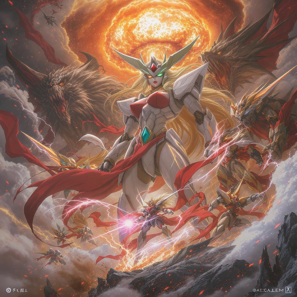 An immensely powerful anime protagonist is envisioned by the creative geniuses Hideaki Anno, Katsuhiro Otomo, and Rumiko Takahashi. A cinematic masterpiece, reminiscent of a blockbuster film poster, capturing a stunning narrative. The centerpiece showcases the main character, radiating strength and determination. Surrounding her, colossal monsters and intricate mech warriors are engaged in an epically choreographed battle. The horizon is ignited with brilliant nuclear explosions, painting the sky with both beauty and devastation. The scene is crafted with exceptional detail and clarity, embodying an 8k resolution masterpiece that captures the imagination, expertly blending elements of heroism, conflict, and awe-inspiring visuals.