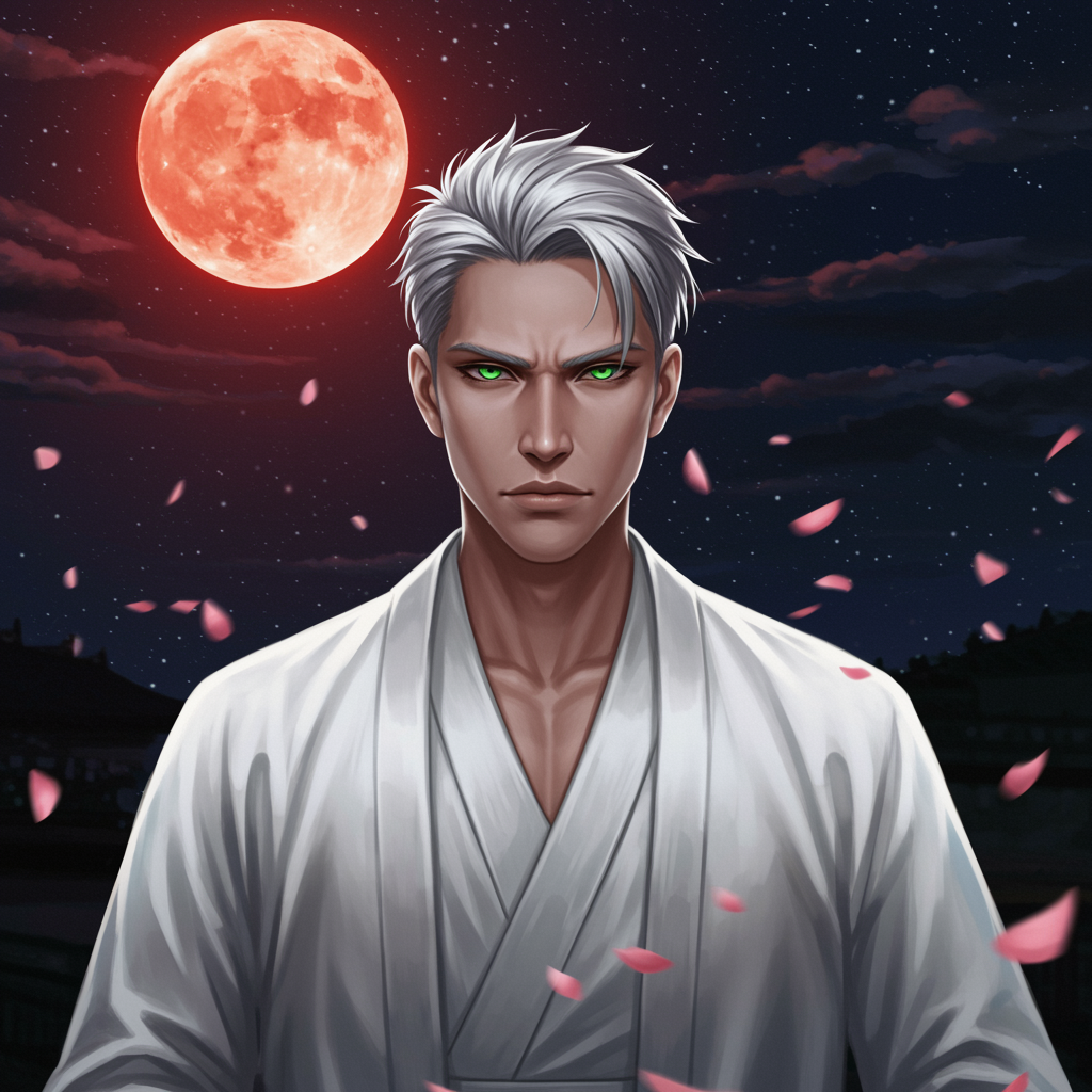 Powerful male character with striking green eyes and short silver hair, donned in an elegant white robe. The scene unfolds under a vivid blood moon, casting its mysterious light. It's night, and delicate flower petals dance through the air. Captured in a front portrait shot with side lighting, the moon's glow enhances their features. The atmosphere is rich and detailed, boasting an 8K resolution for breathtaking clarity.