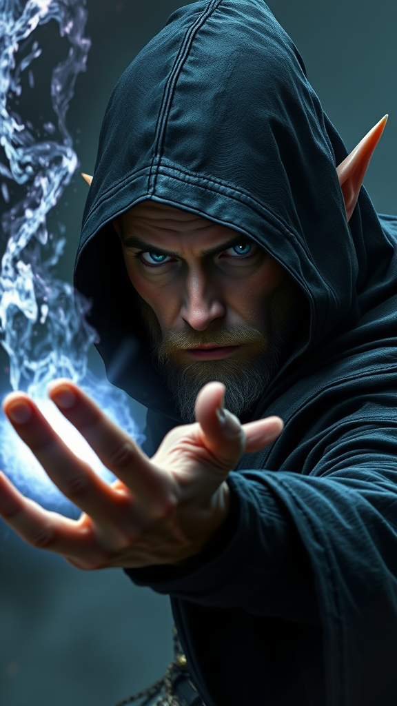 Powerful male elf casting a spell, inspired by Dalamar The Dark from Dragonlance, wearing a black hood, enigmatic elf wizard in the midst of magical combat, featuring a detailed, expressive face and eyes. Masterpiece quality, photorealistic, 8k resolution, capturing the mysterious allure and intensity of the character. Styled by the artistic influences of Jeremy Mann, Sandra Chevrier, and Maciej Kuciara, with a sharp realistic design emphasizing real shadows in a 3D setting. Avoid low resolution, extra limbs or fingers, facial hair, additional clothing colors, childlike features, nudity, or cartoonish elements.