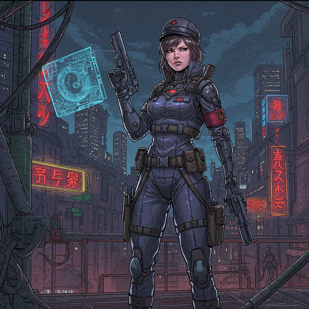 powerful woman officer, dystopian Japanese cityscape, moody dark sky, manga influence, highly detailed intricate line work, cell shading style, comic book aesthetic, graphic novel feel, digital painting, rich color illustration, inspired by Masamune Shirow, character detail akin to Hajime Shimomura, --c 20 --ar 9:7, futuristic technology integration, neon accents, reflective surfaces, dynamic pose, urban skyline backdrop, storytelling elements woven into the environment.