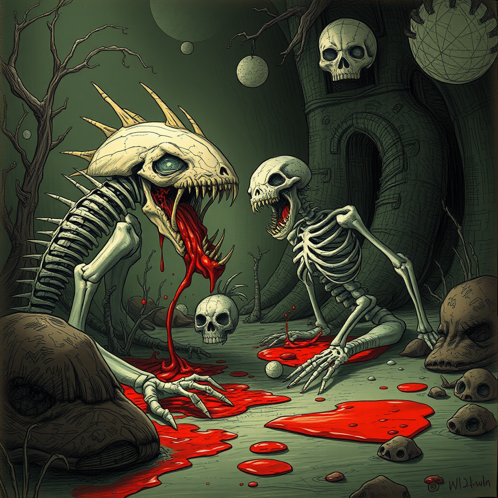 Predatory plants consume mythical creatures in a surreal landscape, detailed sketchwork with intricate drawing and storybook illustration styles, moody lighting creates an atmospheric scene, with capillary graphics and distinct stylization. The setting reveals skeletal forms with visible spines, ribs, and joints, surrounded by thick red fluid and puddles, enhancing the eerie ambiance.