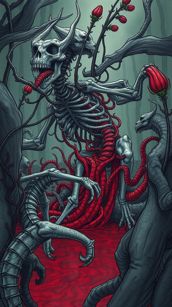 Predatory plants engulfing mythical creatures, sketch-like aesthetics intertwined with detailed drawings, moody lighting with stylized capillary graphics, highlighting skeletal structures, spine, ribs, joints, and bones amid a setting of crimson streams and pools, with an aspect ratio of 9:16 and maintaining a surreal yet haunting atmosphere.