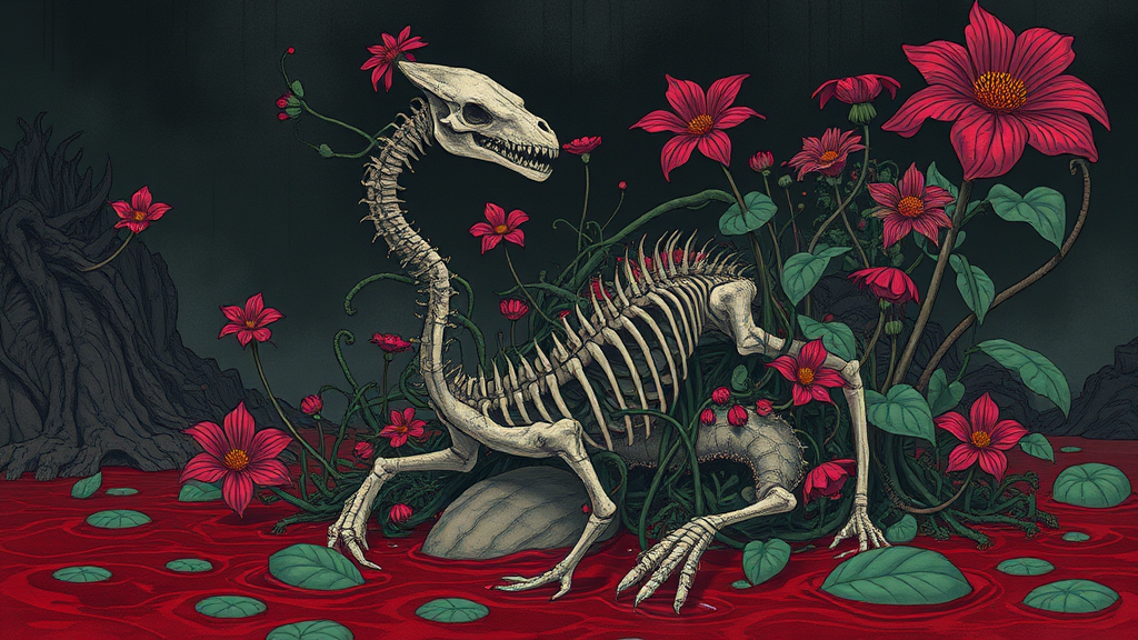 Predatory plants entangle and consume mythical creatures in a moody, atmospheric scene. The illustration combines capillary-like graphics and stylized elements to highlight the interaction between flora and beasts. Skeletal structures with exposed spine, ribs, and joints are intertwined with vibrant plants amid pools of thick red liquid, creating a haunting and surreal landscape with a vertical composition.