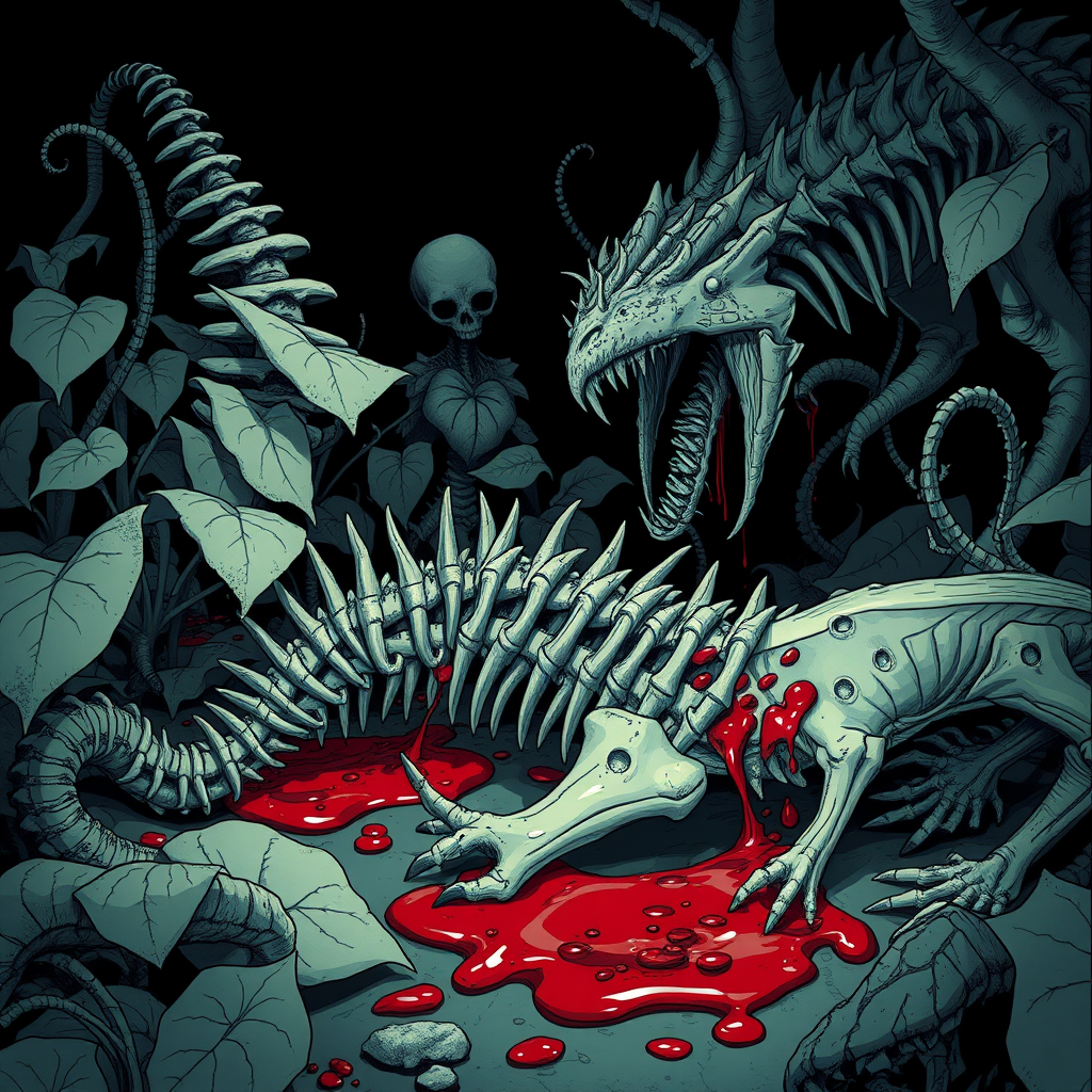 Predatory plants feast on monstrous creatures, capturing the essence in a moody scene. The artwork features intricate sketches and detailed drawings, styled with storybook illustration flair. The atmosphere is enhanced by moody lighting, emphasizing a capillary graphic style and bold stylization. Central to the scene is the focus on spine, ribs, joints, and bones, intertwined with red, thick liquid, forming ominous puddles. The overall ambiance is both haunting and captivating, blending nature's ferocity with ethereal design elements.