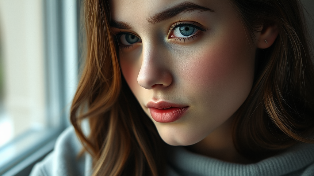 Premium quality, stunning masterpiece, intricately detailed, ultra-precise close-up RAW shot, analog-esque photograph of a young woman, captured in 8k Ultra HD with a DSLR camera, showcasing exceptional quality and subtle film grain. She wears a cozy sweatshirt, exhibiting timeless style and effortless grace in her expression. The image radiates an authentic, vintage charm, with soft lighting that enhances the subject's tranquil aura and the texture of the clothing.