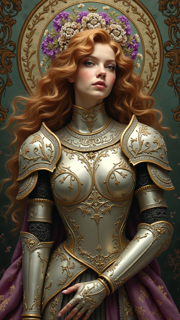 The artwork presents a captivating blend of diverse styles and techniques, seamlessly merging elements of Art Nouveau, Baroque, and Rococo. Intricate swirling patterns and organic forms characteristic of Art Nouveau adorn the armor of the Princess, while the lavish opulence and majestic grandeur of Baroque and Rococo influence are infused throughout the composition, creating a harmonious and enchanting visual masterpiece.